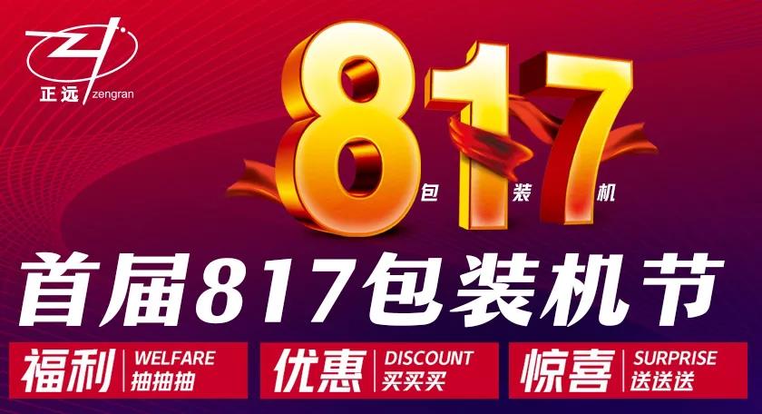 從此以后,我們要為之歡騰的不僅僅是雙十一(11.11)、雙十二(12.12)。不再羨慕別人的節日,因為《817包裝機節》有福利、有優惠、有驚喜;更有思想的碰撞、行業的交流、品牌的傳承;是屬于整個包裝機行業的節日。