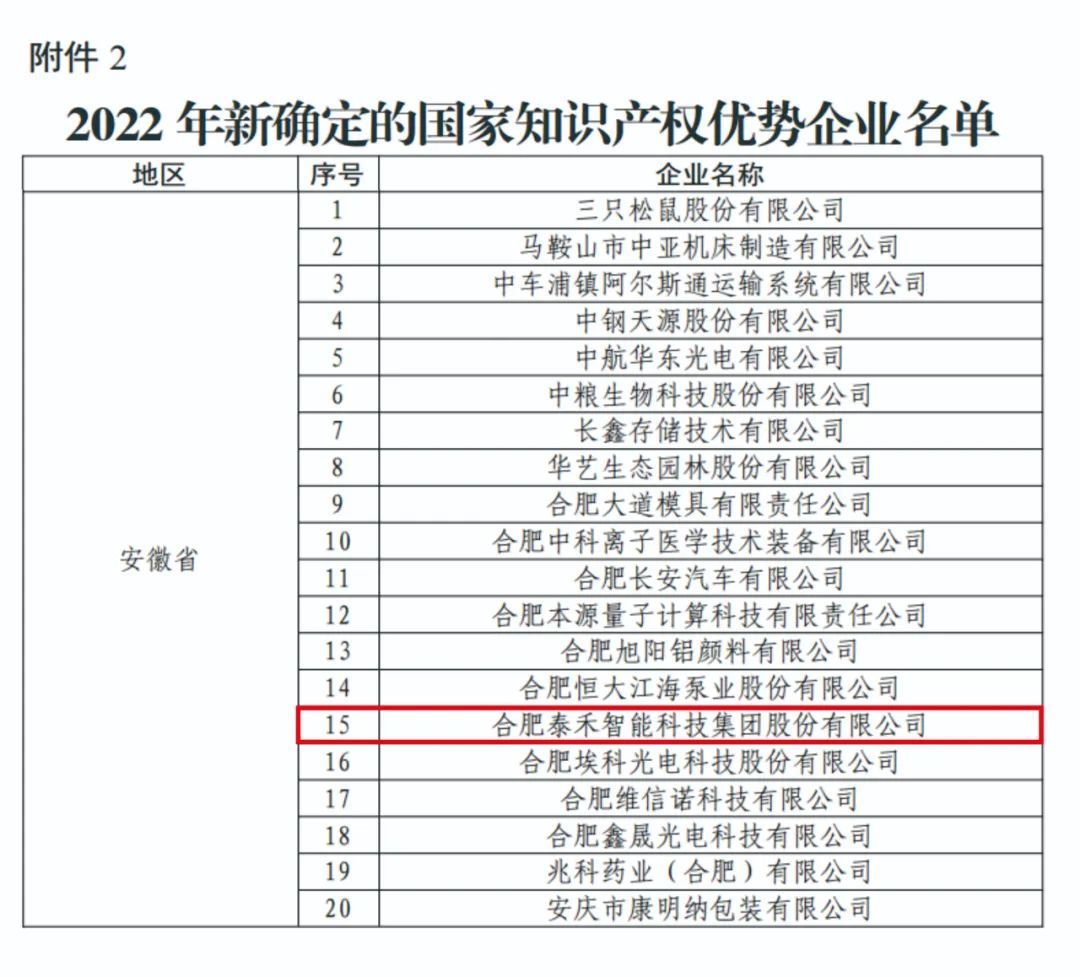 10月27日,國家知識產權局發布《關于確定2022年新一批及通過復核的國家知識產權示范企業和優勢企業的通知》,合肥泰禾智能科技集團股份有限公司被國家知識產權局認定為國家知識產權優勢企業。