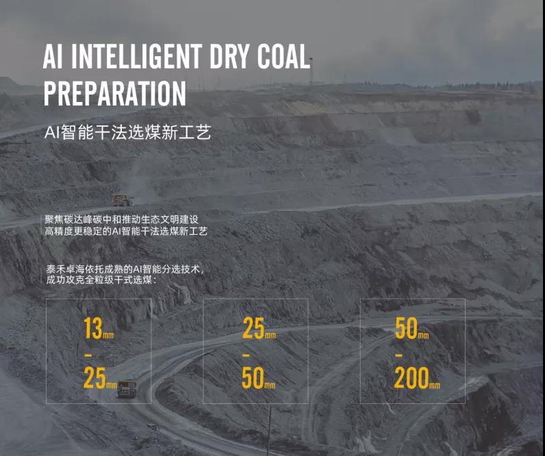 泰禾卓海依靠泰禾智能集團在Al智能分選領域的技術優勢,依托成熟的Al智能分選技術,高精度更穩定的Al智能干法選煤新工藝。成功研發出國內新型Al智能干式選煤設備,填補國內原煤在13mm-25mm、25mm—50mm、50mm—200mm粒級無水選煤工藝的空白,真正引領傳統水洗煤廠到Al智能無水選煤廠的新時代。