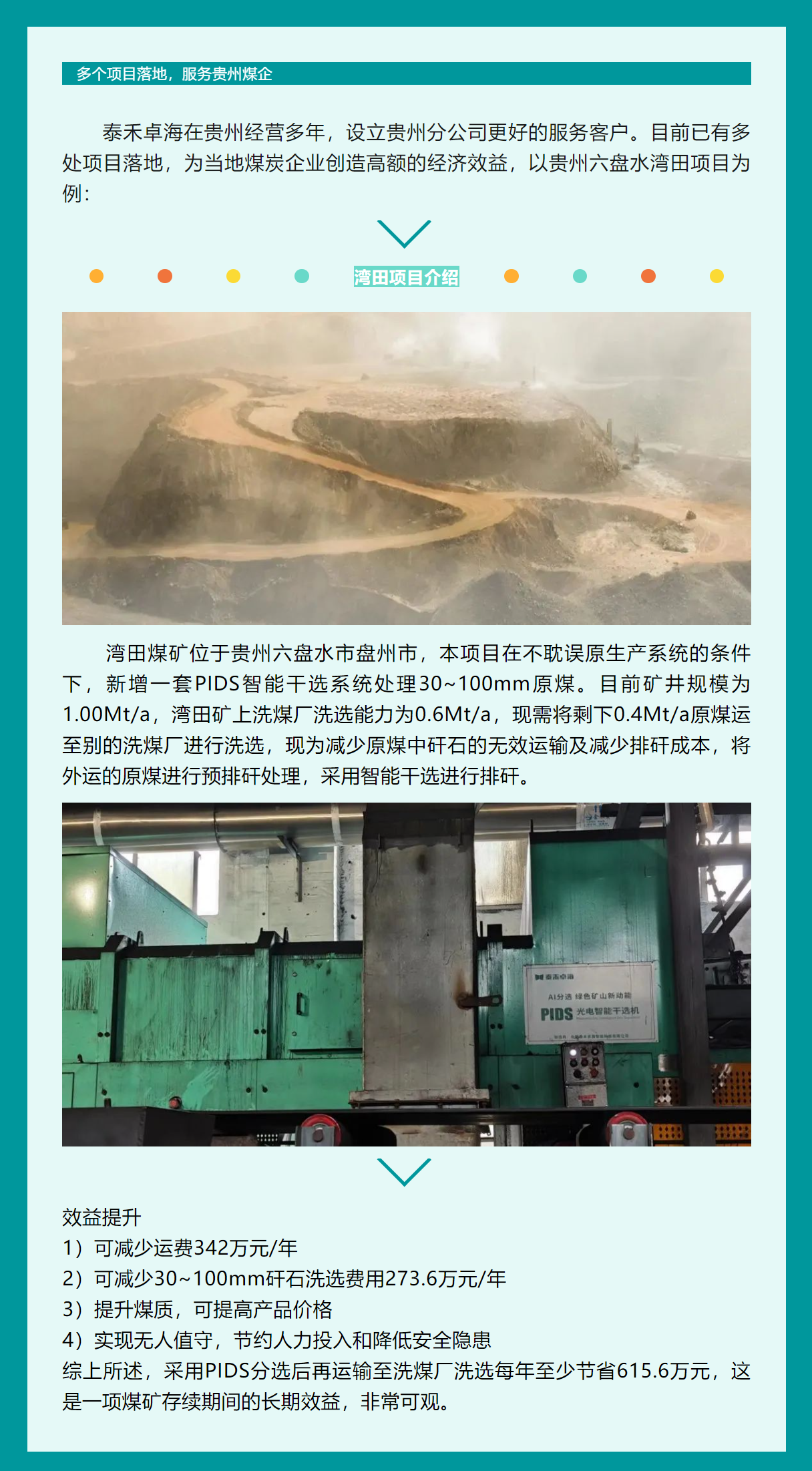 泰禾卓海基于自主研發的干法選煤技術成功研發出的AI智能立式分選機,填補國內原煤在6-20mm、13-50mm、30-80mm、13-200mm、50-200mm粒級無水選煤關鍵裝備的空白,開啟AI智能無水選煤的新時代。其應用場景包括:動力煤、煉焦煤的預排矸,分選出優質動力煤、超低灰精煤,擴展的應用場景包括井下預排矸,高嶺巖回收、炭質頁巖(黑矸)回收等。