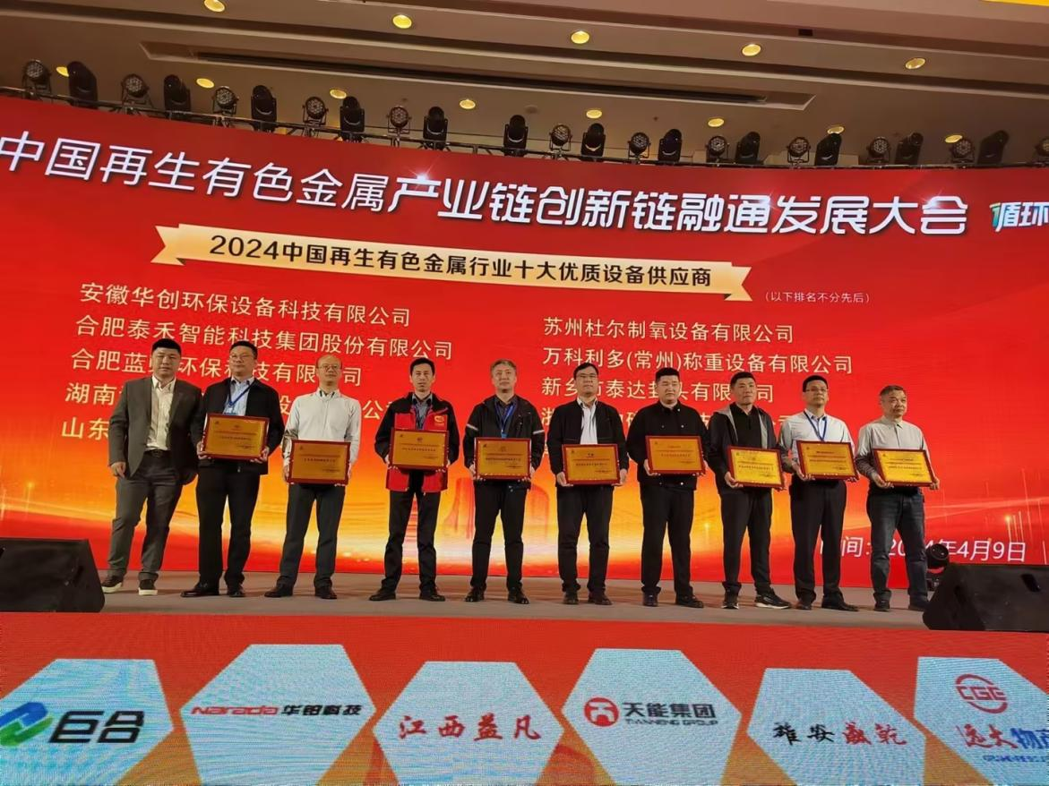 2024年4月8日-9日,中國再生有色金屬產(chǎn)業(yè)鏈創(chuàng)新鏈融通發(fā)展大會在安徽合肥舉行,泰禾智能受邀出席,并獲“2024中國再生有色金屬行業(yè)十大優(yōu)質(zhì)設備供應商”殊榮。
