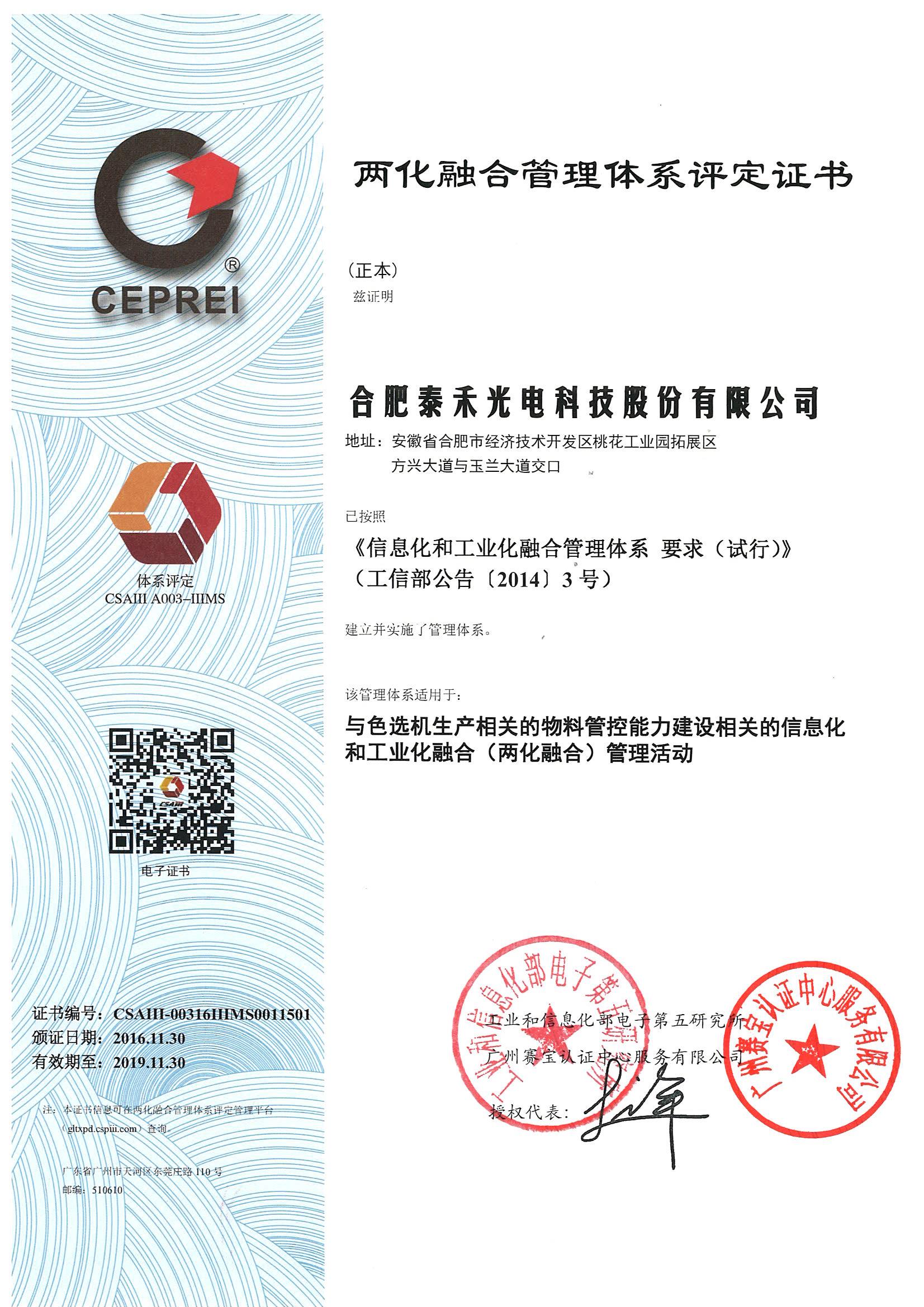 2016年11月30日,工信部兩化融合管理體系工作平臺發布公告,泰禾光電正式通過兩化融合管理體系貫標評定。
