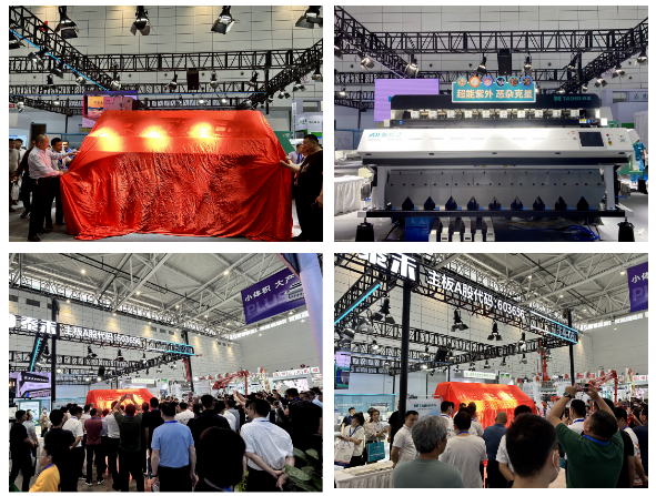 泰禾智能展位現(xiàn)場舉辦新品揭幕儀式,泰禾智能AI智選天眼系列紫外大米色選機(jī)精彩亮相,引爆全場!