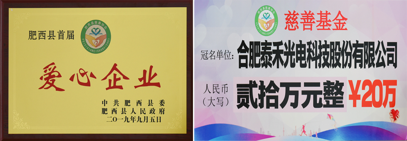 其中合肥泰禾光電科技股份有限公司在肥西縣慈善協會冠名設立了“泰禾光電慈善基金”,同時榮獲肥西縣首屆“愛心企業”光榮稱號。殊榮既是對泰禾光電近幾年來積極開展慈善活動、勇擔社會責任的肯定,也是對泰禾光電在慈善事業方面繼續闊步前行的有力鞭策。