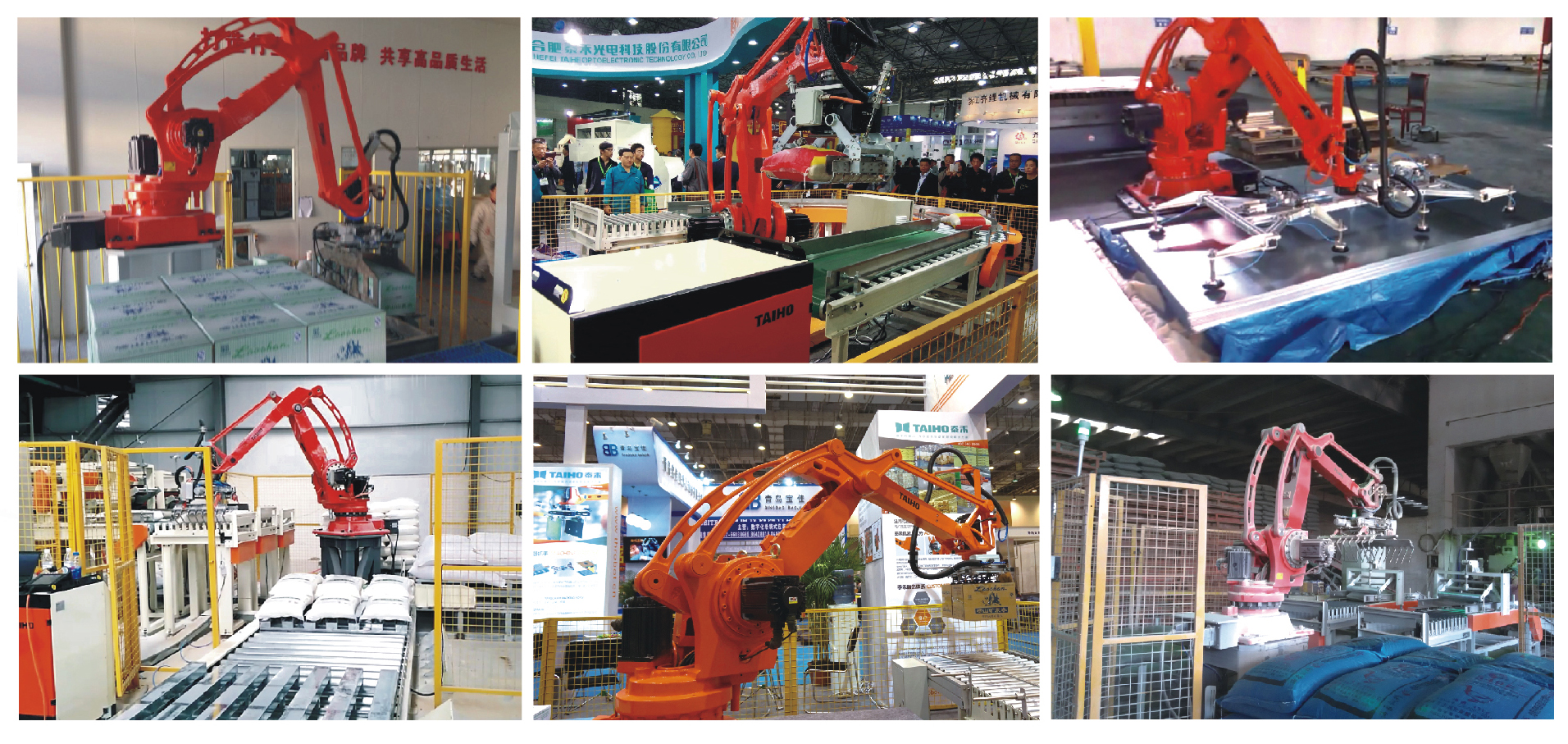 泰禾光電碼垛機器人集機械、電子、控制、計算機、傳感器、人工智能等多學科先進技術于一體,不但滿足碼垛作業要求,更能夠滿足客戶日益高速化、高效化的生產要求,大大節省了勞動力,節省空間。可廣泛應用于糧油、食品、化工、印刷等行業,并憑借良好的性能,受到使用客戶們的一致好評。
