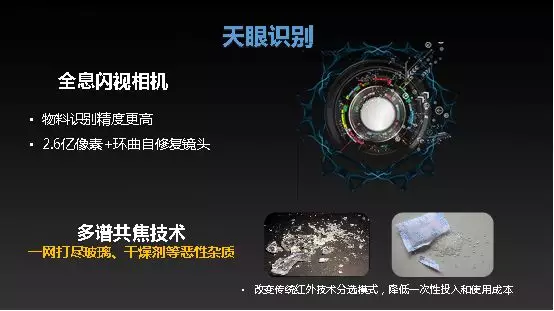 獨創(chuàng)多譜共焦技術(shù)、2.6億像素+環(huán)曲自修復(fù)鏡頭,物料識別精度更高,玻璃、干燥劑等惡性雜質(zhì)無處躲藏。