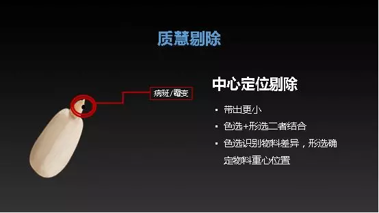 色選+形選二者結(jié)合,色選識別物料差異,辨別好壞,形選確定物料重心位置,實行中心靶向定位剔除,徹底實現(xiàn)帶出小,色選精度無限接近極限最小值。