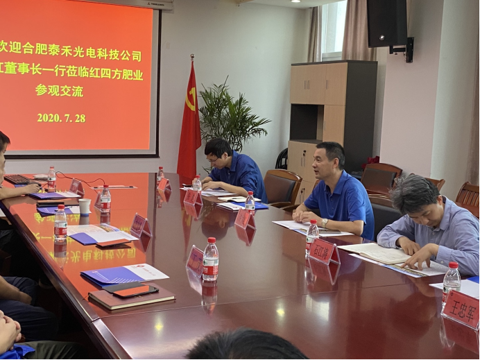 7月28日上午合肥泰禾光電科技股份有限公司(以下簡稱泰禾光電)董事長許大紅先生率管理團隊赴中鹽安徽紅四方肥業股份有限公司(以下簡稱中鹽紅四方肥業)考察交流,隨行人員有泰禾光電副總經理石江濤、子公司總經理張浩、人力與資源中心總監王忠軍、研發事業部智能裝車項目負責人張杰。