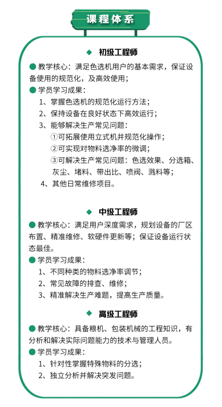 所有參訓學員學習內容包括:色選機基礎知識、基本工作原理、生產前注意事項、加工中需要的調節與操作、加工后的每日維護等課程。