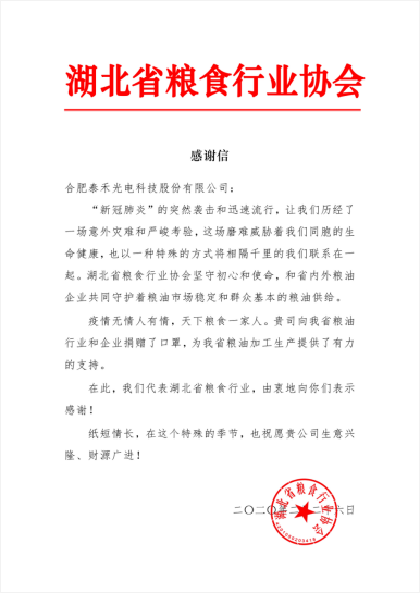 第一批捐贈物資抵達后,湖北省糧食行業協會向泰禾光電發來感謝信,對泰禾光電向湖北省糧油行業和企業捐贈口罩,助力湖北糧油加工生產提供支持,表示感謝。